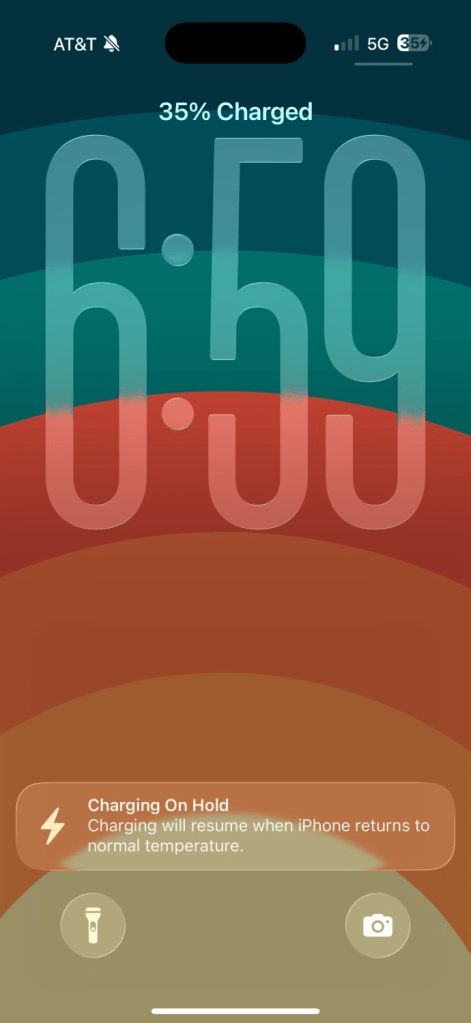 About an 45 minutes later, my phone was at around 35% but stalled. I was met with a notice I’ve never received on any iPhone “Charging on hold. Charging will resume when the temperature of the iPhone returns to normal.”
