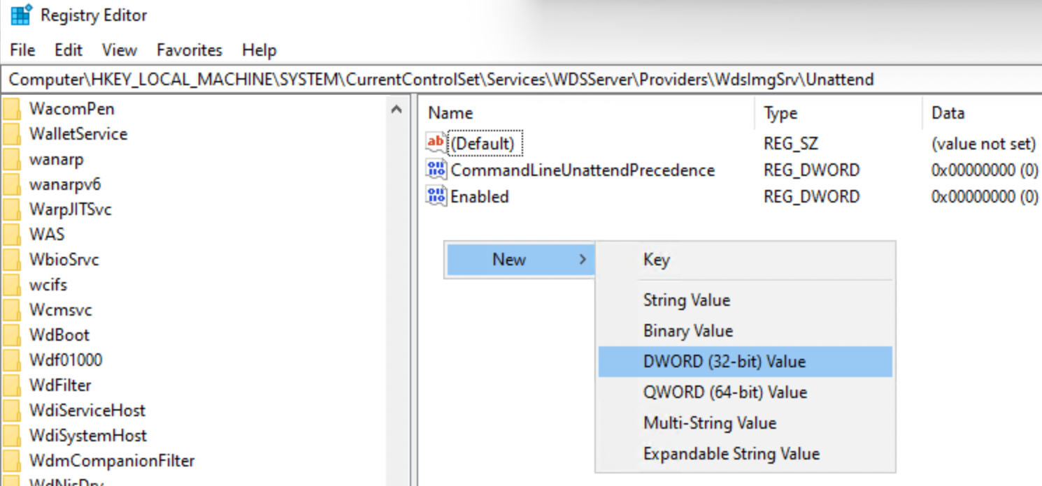 Once you are aware of your environment’s behavior, if you don’t have the DWORD VALUE needed, you can create it here: ComputerHKEY_LOCAL_MACHINE\SYSTEM\Current\ControlSet\Services\WDSServer\Providers\WdsImgSrv\Unattend