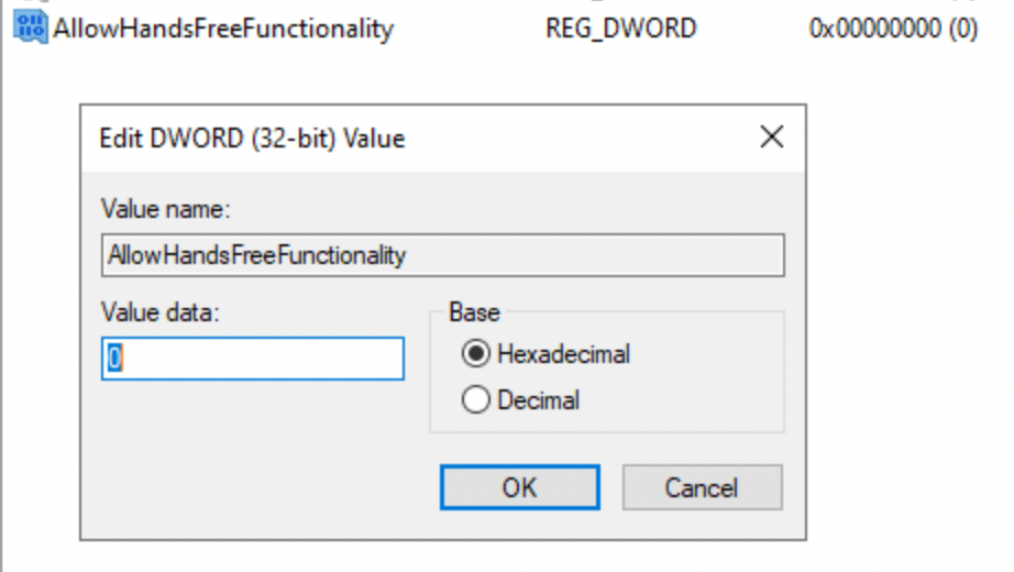 Change the value name to: AllowHandsFreeFunctionality and the value data can be either a 0 or 1