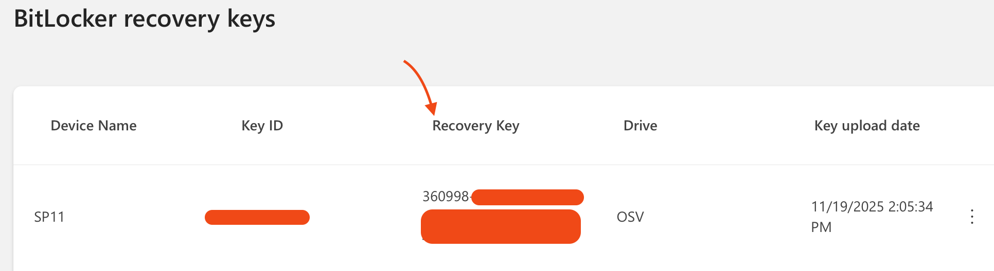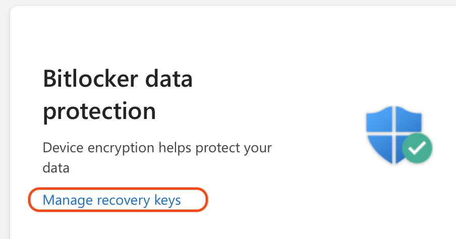 Scroll down to the bottom of the page until you see “Bitlocker data protection” and click “Manage Recovery Keys”