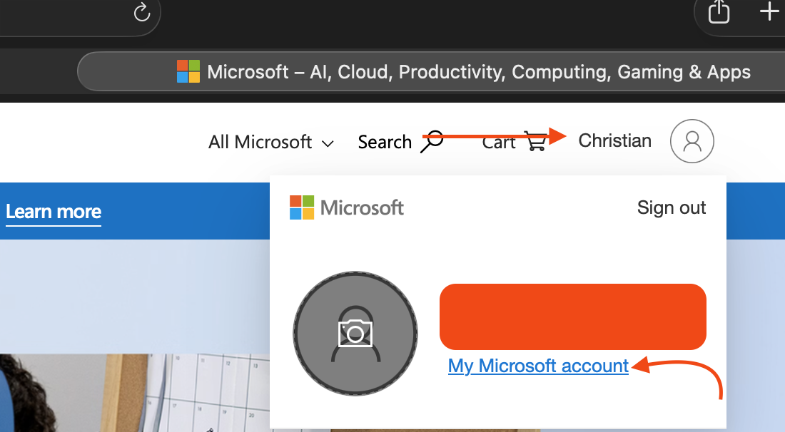 Once signed in, Click your Name > then click “My Microsoft Account”.